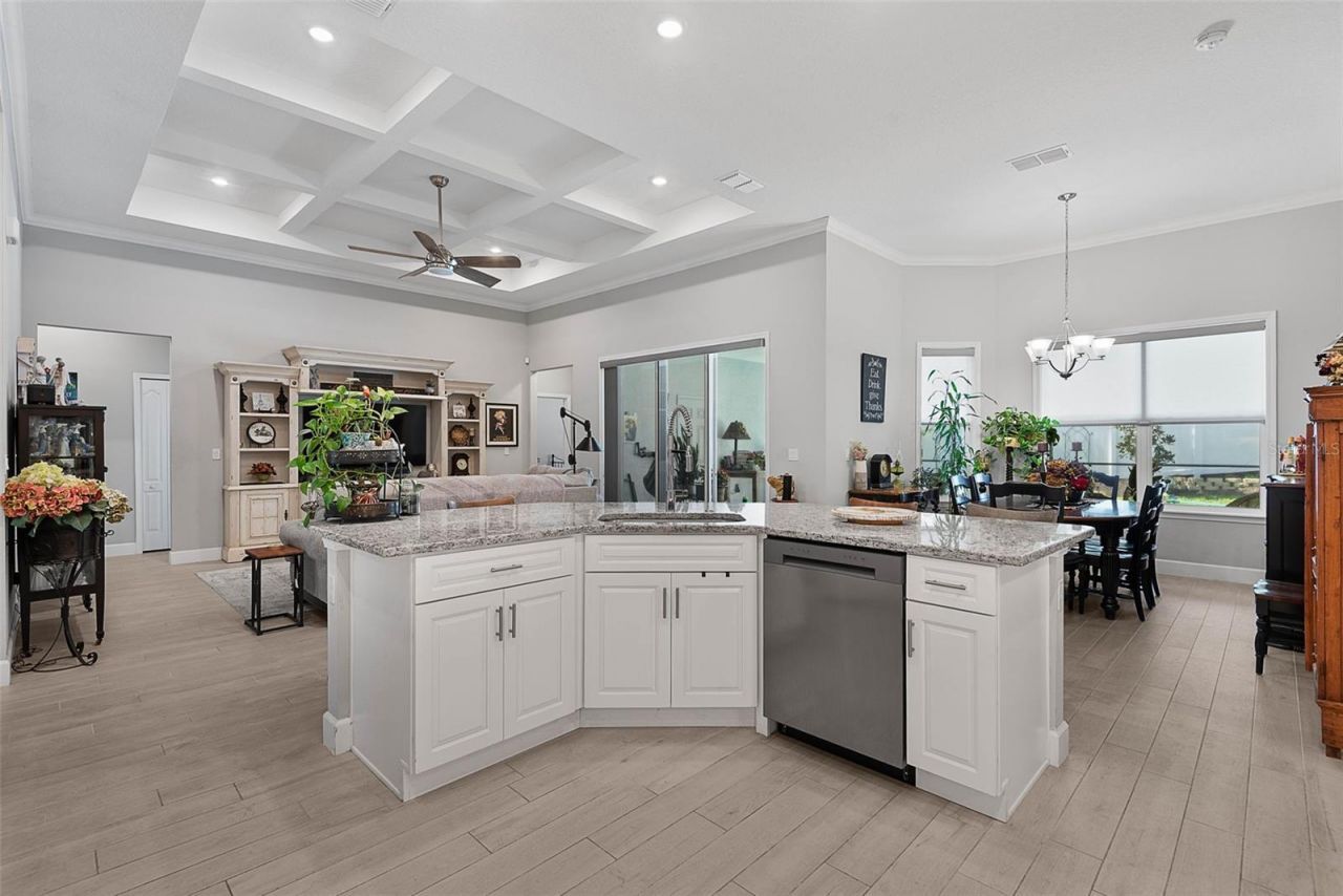 Discover the perfect blend of space, comfort, and functionality in this beautifully designed pool home built by Everlast in 2023. Offering 4 bedrooms, 3 full bathrooms, and a dedicated office, this home features 2,482 square feet of living space and a highly desirable layout built for both everyday living and entertaining.Step inside to find tile flooring throughout the main living areas, bathrooms, and owner's suite, with warm wood laminate flooring in the guest bedrooms for added comfort. Thoughtful upgrades are found throughout the home, including 6-inch baseboards, crown molding, paddle fans, custom window treatments, a coffered ceiling, and a tray ceiling in the owner's suite. The kitchen is thoughtfully appointed with granite countertops, stainless steel appliances, all-wood soft-close cabinetry, under-counter lighting, double kitchen pantries, and crown molding, creating a timeless and upscale feel. Granite countertops continue throughout the home, including in the laundry room, which also features a convenient utility sink. An alarm system adds an extra layer of peace of mind.The open design flows seamlessly to the outdoor living area, where you'll find a screened-in pool and lanai with pool lights, making this true 'pool home ideal for enjoying the Florida lifestyle. The backyard is fully enclosed with vinyl fencing, offering both privacy and a polished look.Additional highlights include an oversized 3-car garage, an irrigation system, and stucco over concrete block construction with high-density foam insulation for added efficiency and peace of mind. With generous living space, quality finishes, and exceptional outdoor amenities, this home offers the best of Florida living.